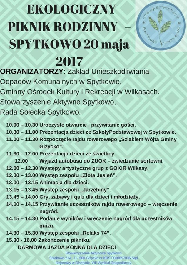 Rajd rowerowy, gry i zabawy animacyjne dla dzieci, koncerty i występy artystyczne - to tylko część atrakcji, która czekać będzie na uczestników Ekologicznego Pikniku Rodzinnego w Spytkowie, który odbędzie się 20 maja we wsi Spytkowo w powiecie giżyckim. Jednym z organizatorów wydarzenia jest Stowarzyszenie Aktywne Spytkowo, któremu w rozwinięciu skrzydeł ekonomii społecznej pomaga na co dzień animator OWES.