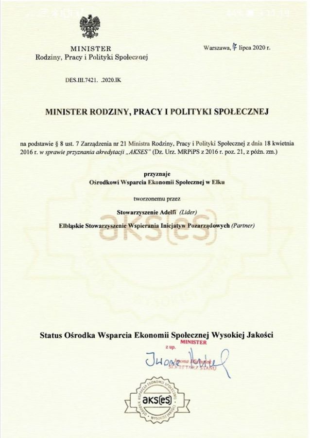 Co to znaczy? Nasz Ośrodek przeszedł urzędową weryfikację spełniania ogólnopolskich standardów i norm pod kątem rozwoju ekonomii społecznej. W jej wyniku otrzymaliśmy znak jakości, który upoważnia nas do dalszych działań związanych ze wspieraniem ekonomii społecznej w subregionie ełckim.