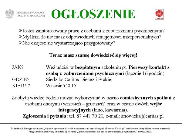 Caritas Diecezji Ełckiej zaprasza na bezpłatne szkolenie pt. "Pierwszy kontakt z osobą z zaburzeniami psychicznymi". Szkolenie odbędzie sie we wrześniu w Ełku. Szkolenie organizowane jest w ramach projektu "Oparcie społeczne dla osób z zaburzeniami psychicznymi z Powiatu Ełckiego".