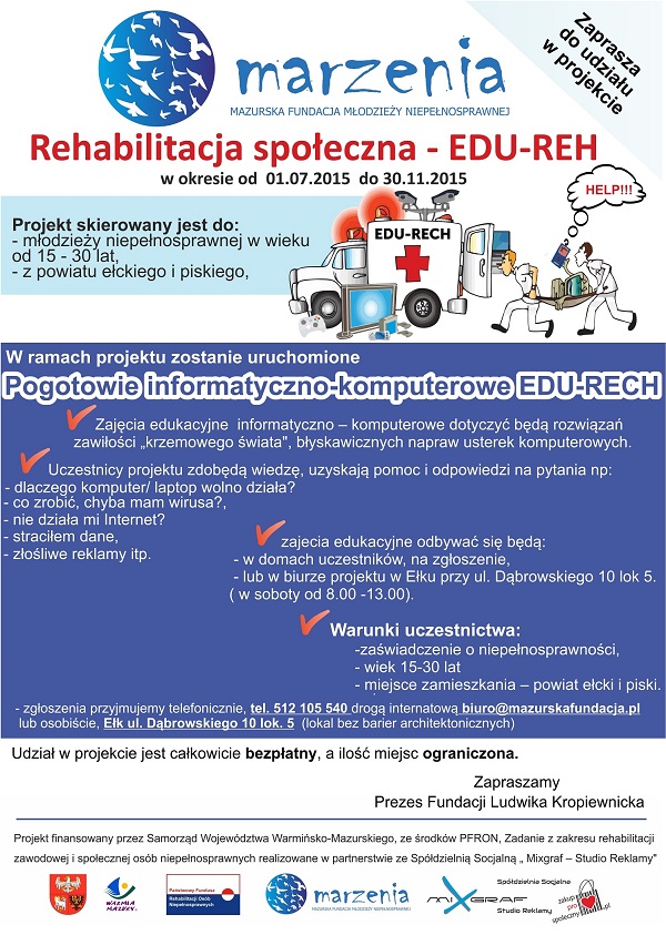 W związku z realizacją projektu pt. "Rehabilitacja społeczna EDU-REH" Mazurska Fundacja Młodzieży Niepełnosprawnej zaprasza do zgłaszania się do udziału w inicjatywie. W projekcie mogą uczestniczyć osoby w wieku 15-30 lat z terenu powiatu ełckiego i piskiego z orzeczoną niepełnosprawnością.