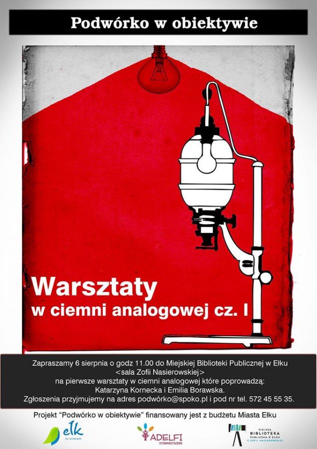 Już wkrótce uczestnmicy projektu "Podwórko w obiektywie" zawitają do Miejskiej Biblioteki Publicznej w Ełku im. Zofii Nasierowskiej, gdzie odbdą się pierwsze warsztaty w ciemni fotograficznej. To świetna okazja aby poznać tajniki jakże już zapomnianej sztuki wywoływania zdjęć. Pierwsza część warsztatów w ciemni analogowej będzie obejmować wykonanie odbitki czarno-białej na papierze fotograficznym wraz z wyjaśnieniem działania powiększalnika, opisem procesu naświetlania i wywoływania. Warsztaty są dla wszystkich, którzy chcą poszerzyć horyzonty swojej wiedzy fotograficznej, sięgnąć do źródeł i wzbogacić swój warsztat o szlachetną technikę, dla tych, którzy cenią unikalne, autorskie odbitki oraz dla tych, którzy lubią eksperymenty i chcą doświadczyć fotografii innymi zmysłami: dotykiem, węchem i słuchem. Warsztaty obejmują naukę od podstaw, ale mile widziani są też uczestnicy zaznajomieni z techniką. Większość czasu poświęcona będzie na praktykę w ciemni, ale przewidziane są również warsztaty w plenerze z aparatami analogowymi i cyfrowymi.