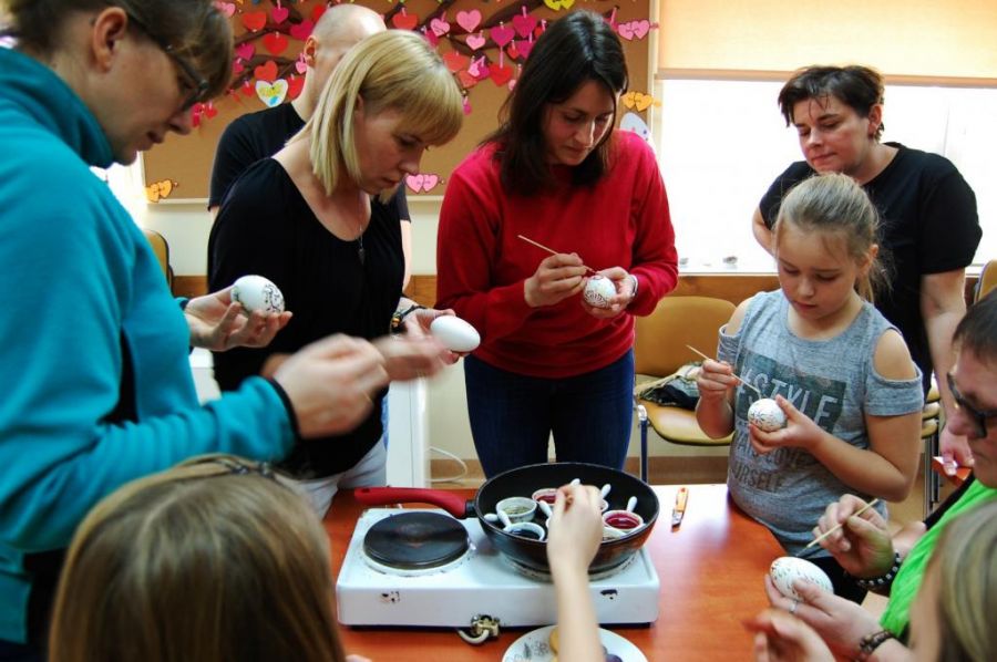 Na zdjęciach możecie zobaczyć również sobotni warsztat z robienia pisanek. Osoby z Przystań Kozin tworzyli je na dwa sposoby - malując woskiem, oraz wydrapując.