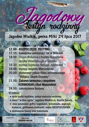 W sobotę 29 lipca we wsi Jagodne Wielkie w gminie Miłki odbędzie się Jagodowy Festyn Rodzinny organizowany przez Sołectwo Jagodne Wielkie. W programie m. in. hawajskie animacje, występy artystyczne oraz zabawa taneczna do północy. Wydarzenie organizowane jest przy wsparciu Ośrodka Wsparcia Ekonomii Społecznej w Ełku. Zapraszamy!