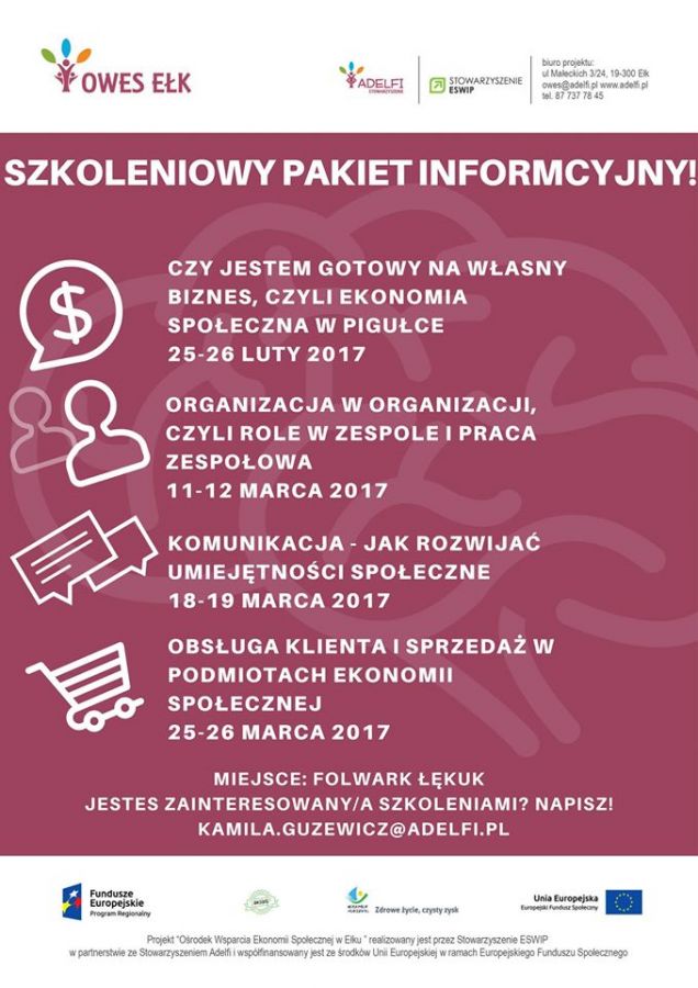 Ośrodek Wsparcia Ekonomii Społecznej w Ełku, prowadzony przez Stowarzyszenie ADELFI zaprasza na szkolenia otwarte w miesiącu marcu.