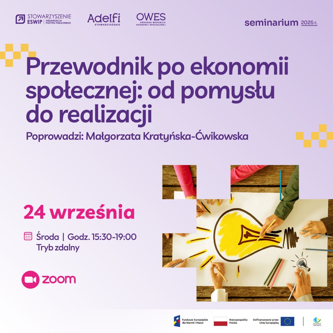 Seminarium realizowane jest w ramach projektu „Ośrodek Wsparcia Ekonomii Społecznej w Ełku”, który realizowany jest przez Stowarzyszenie Adelfi w partnerstwie ze Stowarzyszeniem ESWIP i współfinansowany jest ze środków Unii Europejskiej w ramach Europejskiego Funduszu Społecznego Plus.