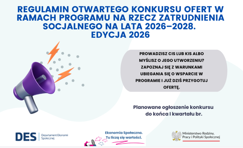 Regulamin Programu na Rzecz Zatrudnienia Socjalnego. Edycja 2026 w załączeniu.